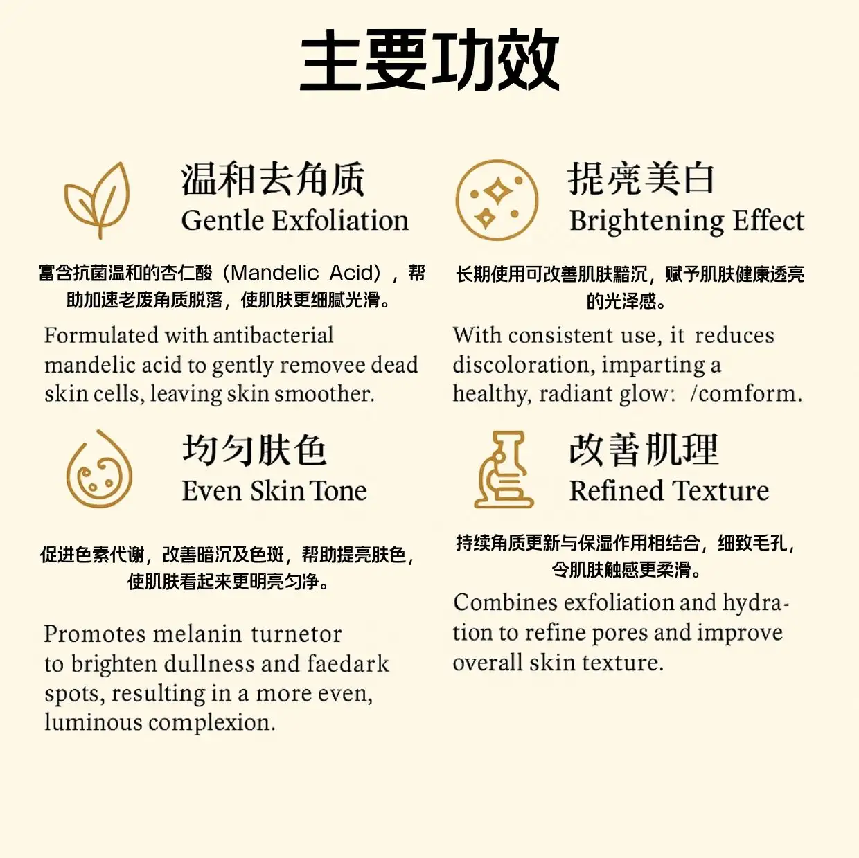 蕴含 杏仁酸护理配方,帮助温和调理肌肤角质,改善暗沉与粗糙,让肌肤更细致、柔滑、有光泽 ✨